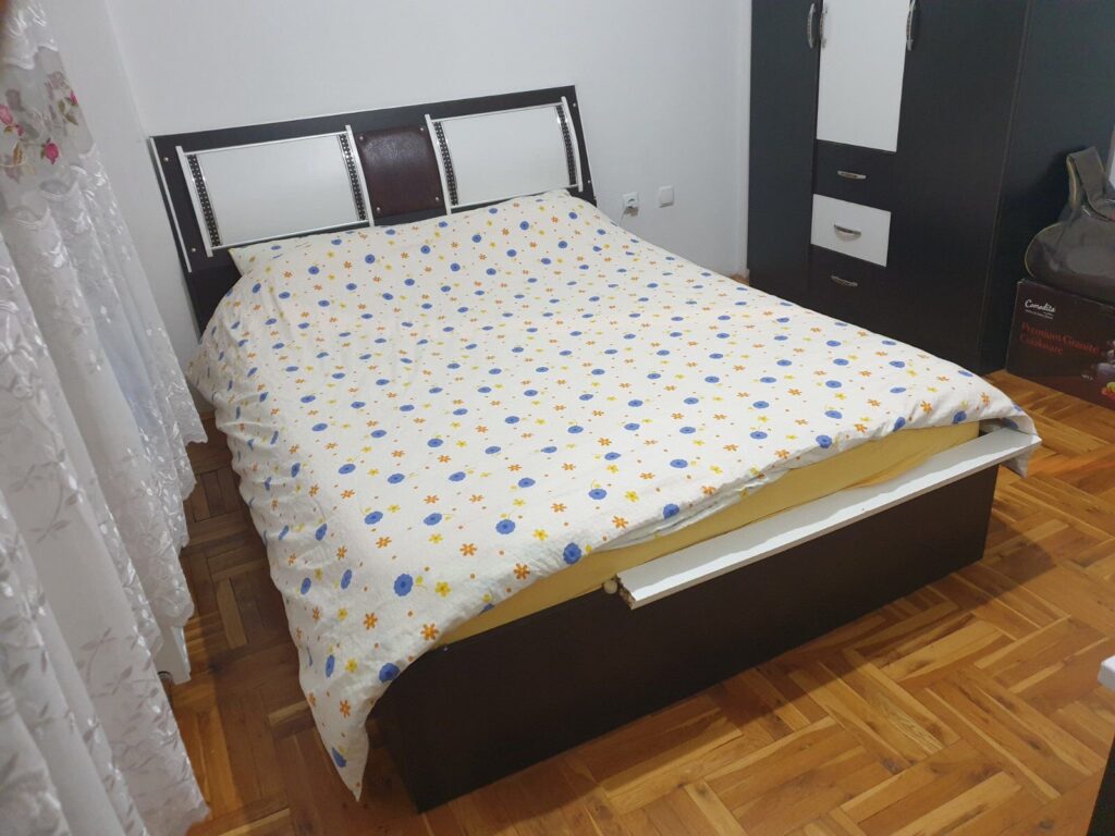 Banesë për qira në Kalabri (Emshir). Vendndodhja te Kullat e Arabëve me qasje të shpejtë në shërbime dhe zona kyçe. Me një renditje : sallon + kuzhinë, dhomë gjumi dhe banjo. E mobiluar dhe sistem Termokos për ngrohje – gatshme për të jetuar menjëherë!