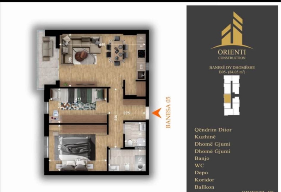 Po kërkoni një banesë luksoze dhe të rehatshme? Shitet banesa me dy dhoma gjumi dhe dy banjo në objektin “Orienti 9” në Fushë Kosovë, përballë rrugës “Dardania”. E pozicionuar në katin e 7-të, me një sipërfaqe prej 84m², kjo banesë ju dhuron komoditet maksimal dhe jetesë plot gjelbërim. Kompleksi banesor ofron hapësira rekreacioni, kënde lojërash për fëmijë dhe parkingje të mjaftueshme, si dhe ndodhet pranë shkollës “Mihal Grameno” dhe Qendrës së Mjekësisë Familjare.