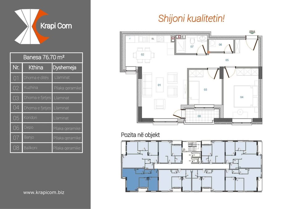 Ofrohet për shitje banesë në Lagjen Mati 1, ndodhet tek Super Viva e parë, Kompleksin Krrapi. Posedon 76.70m2 në katin e 4-të me ashensor funksional.